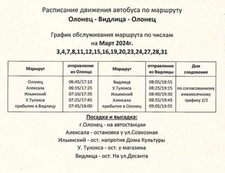 с 3 марта 2024 года ООО «АТП» вводит автобус по маршруту Олонец-Видлица-Олонец. Который будет осуществлять маршрут в соответствии с графиком (на март 2024 г.), прилагается.